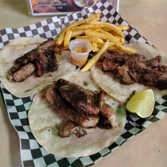 Disfruta de jugosa carne 🥩🍖 3 tacos acompañado de papas y salsa picante de la casa !!
